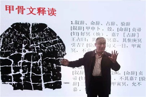 接著,在歷時(shí)兩個(gè)半小時(shí)的分享中,郝教授以融合發(fā)現(xiàn)、甲骨文字拆分、甲骨文書風(fēng)及甲骨文書法創(chuàng)作為立足點(diǎn),襯以個(gè)人習(xí)書作品,從文化本義的內(nèi)涵、文化本義的要素、文化的生成和甲骨文的演化和發(fā)展等方面詳細(xì)闡述了文化的來源以及人類社會(huì)進(jìn)步的過程。