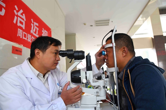 11月8日是記者節(jié)。為了讓奔波在新聞戰(zhàn)線,熬夜趕稿、組版的編輯記者眼睛更健康,11月5日,周口愛爾眼科醫(yī)院的醫(yī)生將儀器搬到周口報(bào)業(yè)傳媒集團(tuán),現(xiàn)場(chǎng)為編輯記者檢查眼睛,關(guān)愛新聞工作者的身心健康。圖為眼科醫(yī)生為記者檢查視力、實(shí)施治療。記者 劉俊濤 梁照曾 攝
