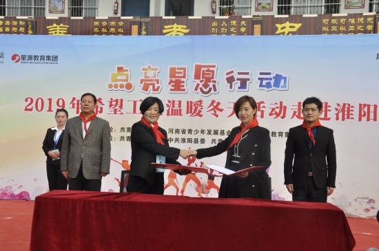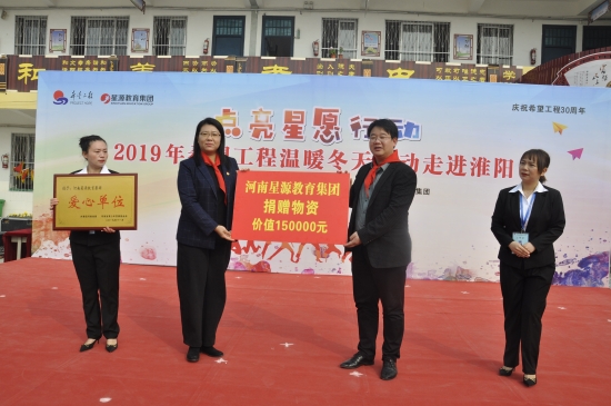 11月8日,由共青團河南省委、河南省青少年發(fā)展基金會、河南星源教育集團主辦,共青團周口市委、中共淮陽縣委、共青團淮陽縣委承辦的慶祝希望工程30周年“點亮星愿行動”2019年希望工程溫暖冬天活動走進淮陽在淮陽縣城關(guān)鎮(zhèn)北關(guān)學校隆重舉行。