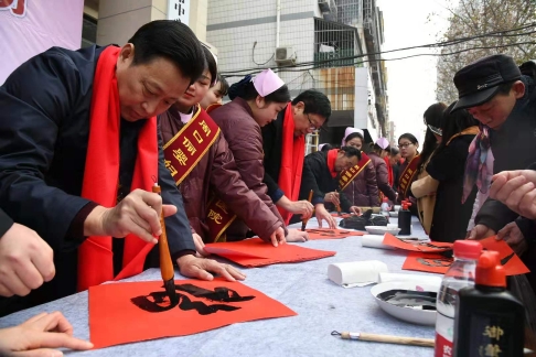 18日上午9時30分,位于新建街的周口儷嬰婦女兒童醫(yī)院門前喜氣洋洋,張燈結(jié)彩,熱鬧非凡,儷嬰婦女兒童醫(yī)院邀請市書協(xié)、川匯區(qū)書協(xié)的書法家們,在門前為“送福送健康暨書法家義寫春聯(lián)”活動舉行了簡短的儀式,隨即活動展開,一邊是儷嬰婦女兒童醫(yī)院的專家們將坐診臺搬到門前,細致地為來往的居民免費量血壓、把脈等義診,一邊擺下10多張桌子和筆墨紙硯,中國書協(xié)會員游保峰,著名書法家、川匯區(qū)書協(xié)終身名譽主席李大慶,書法家馮干敏、李輝、李國斌及川匯區(qū)書協(xié)主席李尊杰,市書協(xié)副主席劉廣巖,川匯區(qū)書協(xié)副主席兼秘書長杜忠義,副主席曾祥峰、何楠,著名書法家寇成義等書法家們,展開大紅的紙張,揮毫潑墨,飄著墨香的福字和一對對大紅的春聯(lián),帶著新春的祝福,送到居民手里,一波波居民到自己喜愛的書法家面前,喜討福字和春聯(lián),開心的喜悅洋溢著臉上……
