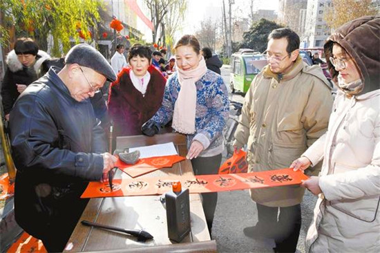 1月19日,由周口市民間文藝家協(xié)會、川匯區(qū)文聯(lián)聯(lián)合舉辦的“送萬福進萬家”義寫春聯(lián)活動,在周口華威民俗文化博物苑門前舉行。來自市書協(xié)、川匯區(qū)書協(xié)的20多名書法家現(xiàn)場揮毫潑墨,義寫春聯(lián)和“?!弊郑艿绞忻竦囊恢潞迷u。記者 梁照曾 攝