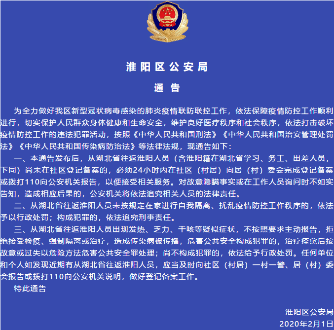 今天,淮陽區(qū)公安局發(fā)通告:從湖北返淮人員務必24小時內……