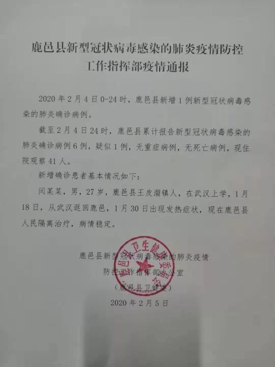 截至2月4日24時(shí),鹿邑縣累計(jì)報(bào)告新型冠狀病毒感染的肺炎確診病例6例,疑似1例,無重癥病例,無死亡病例,現(xiàn)住院觀察41人。