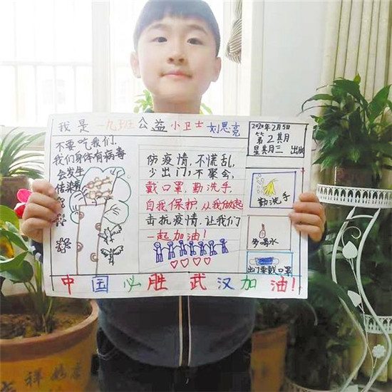 周口六一路小學(xué)近日布置了一項(xiàng)作業(yè),要求學(xué)生設(shè)計(jì)一張防疫宣傳小報(bào),為武漢加油。該校學(xué)生用漫畫(huà)的形式呼吁大家勤洗手、戴口罩、多喝水、多通風(fēng)。記者 王晨 通訊員 李琨 攝
