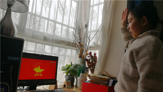 2月25日,周口市文昌小學(xué)三(5)班一名學(xué)生在家中敬隊(duì)禮、唱隊(duì)歌。自新冠疫情發(fā)生以來(lái),周口市文昌小學(xué)通過(guò)網(wǎng)絡(luò)授課方式,使孩子們停課不停學(xué)。當(dāng)日,該校組織學(xué)生在網(wǎng)上觀看“河南省少先隊(duì)活動(dòng)抗疫專題示范課”,讓孩子們學(xué)到了很多關(guān)于新冠肺炎的相關(guān)知識(shí)。