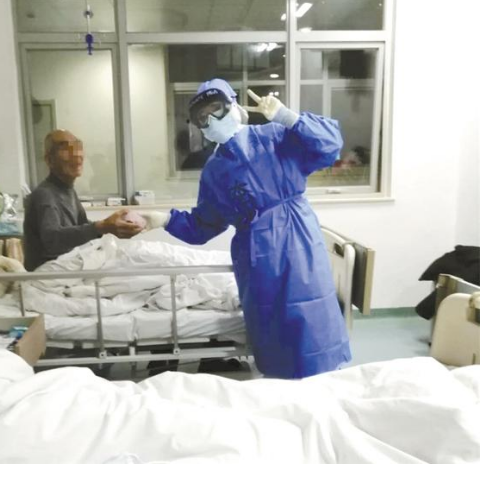 “這是我們應(yīng)該做的工作。您辛苦了,一定要加油哦?!弊鐾隀z測、量完體溫,胡奔奔將9號床患者的手輕輕放進(jìn)被子,并為他掖了掖被角。