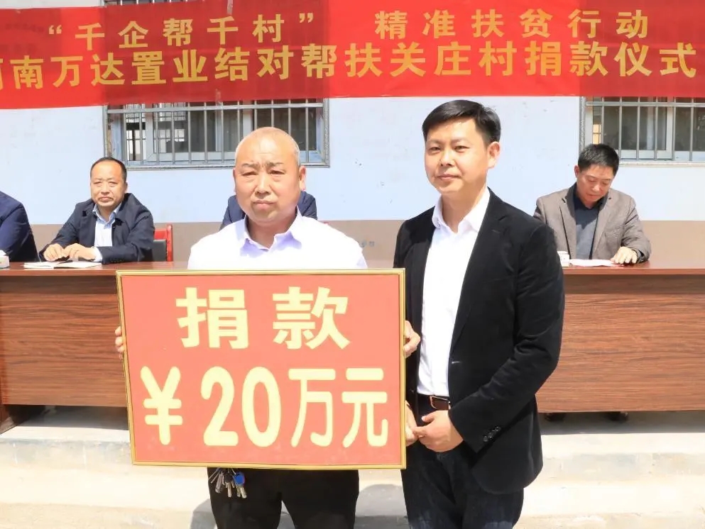 4月13日上午,河南萬(wàn)達(dá)置業(yè)有限公司結(jié)對(duì)幫扶捐款儀式在市城鄉(xiāng)一體化示范區(qū)許灣鄉(xiāng)關(guān)莊行政村隆重舉行?,F(xiàn)場(chǎng),該公司為關(guān)莊行政村捐款20萬(wàn)元助力脫貧攻堅(jiān)。