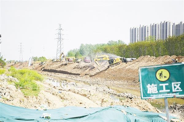 4月15日上午,洼沖溝水系植物園杜樓橋施工現場,幾十輛工程機械車緊張作業(yè),熱火朝天的施工場景令人振奮。