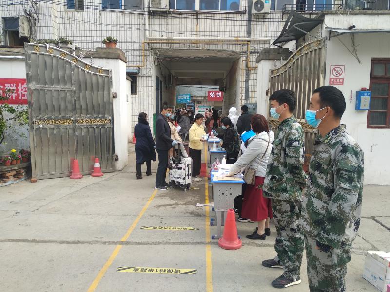 “同學(xué)們,請(qǐng)排好隊(duì),與前面的人保持1米以上的距離?!?月20日上午,在鄲城縣華宇中學(xué),來自洺南街道基干民兵應(yīng)急分隊(duì)的民兵們正在現(xiàn)場(chǎng)維護(hù)秩序,幫助該校做好九年級(jí)學(xué)生復(fù)學(xué)入校防疫工作。