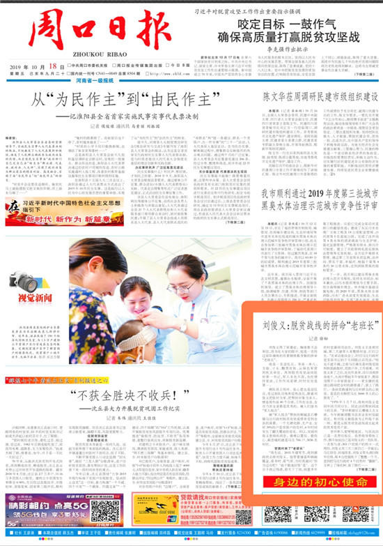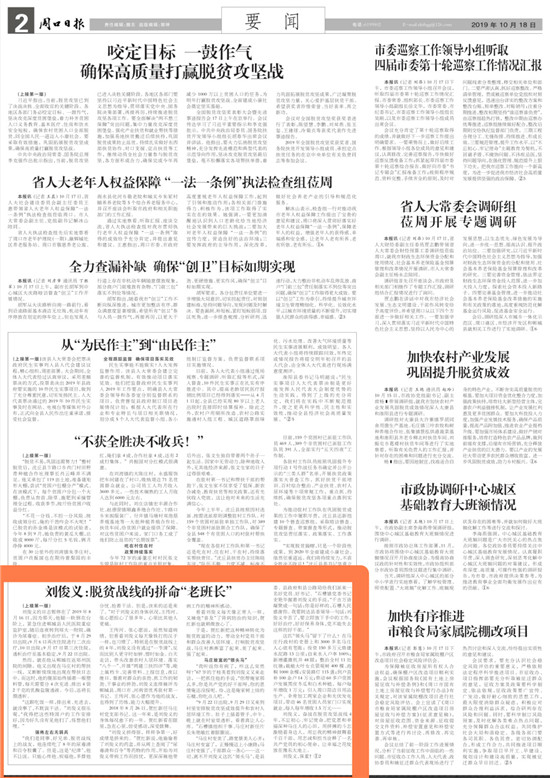 2019年10月18日,《周口日?qǐng)?bào)》頭版轉(zhuǎn)版,以《劉俊義:脫貧戰(zhàn)線的拼命“老班長(zhǎng)”》