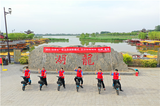 當(dāng)日38度的高溫酷熱擋不住檢察干警守護淮陽河暢、水清、湖凈、岸綠、景美的決心和信心,30名檢察干警、志愿者騎電車圍湖宣傳,為市民進行相關(guān)政策的講解,號召市民熱愛龍湖,告知群眾及社會各界人士參與檢察公益保護的方式和途徑,公開聯(lián)系電話,微信公眾號,方便群眾通過多種渠道提供案件線索。