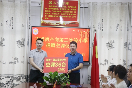 “方遠(yuǎn)房地產(chǎn)公司為第三實(shí)驗(yàn)小學(xué)捐贈(zèng)空調(diào),大大改善學(xué)校的降溫條件,為孩子們營(yíng)造更為舒適的學(xué)習(xí)環(huán)境?!钡谌龑?shí)驗(yàn)小學(xué)校長(zhǎng)王玉剛表示,學(xué)校將以此為契機(jī),號(hào)召?gòu)V大學(xué)生好好學(xué)習(xí),長(zhǎng)大后回報(bào)社會(huì);全校教職員工以優(yōu)異的教學(xué)業(yè)績(jī)回報(bào)社會(huì),傳遞愛(ài)心,努力辦學(xué)生快樂(lè)、教師幸福、家長(zhǎng)滿意的現(xiàn)代化學(xué)校。