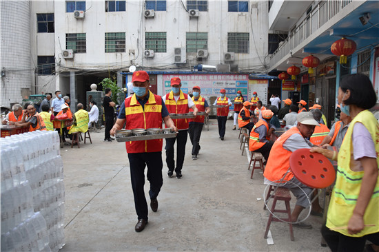 早上5點(diǎn)多,志愿者來到愛心粥屋,擺放桌椅,組織環(huán)衛(wèi)工人有序入座,有的為環(huán)衛(wèi)工人炒菜、燒湯,有的為他們端饃、盛菜、送湯,一碗碗熱乎乎的飯菜遞到環(huán)衛(wèi)工人手上,志愿者們面帶微笑,動作迅速而小心冀冀,態(tài)度熱情而尊敬有禮,現(xiàn)場氣氛十分和諧。清香的米粥、松軟的饅頭、香噴噴的炒菜,一頓不算豐盛的早餐讓前來就餐的環(huán)衛(wèi)工人感到愛意融融,環(huán)衛(wèi)工人就餐結(jié)束后,志愿者及時把桌椅整理好,清洗碗筷餐具,打掃好現(xiàn)場衛(wèi)生。