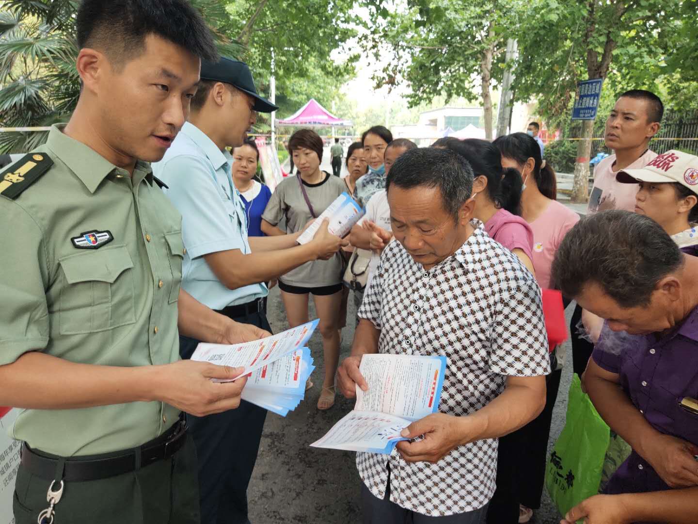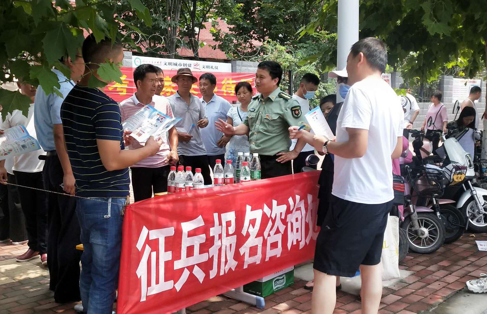 為強(qiáng)化全民依法履行兵役義務(wù)觀念,激發(fā)廣大適齡青年特別是高學(xué)歷青年參軍入伍熱情,7月7日至8日,項(xiàng)城市人武部組織機(jī)關(guān)所有人員和21個(gè)鎮(zhèn)(街道)辦事處武裝部長(zhǎng)等36人,深入各考點(diǎn)設(shè)立征兵政策咨詢點(diǎn),懸掛宣傳標(biāo)語(yǔ)、擺放宣傳版面,開展以助力高考為目的的大學(xué)生征兵宣傳活動(dòng)。為不影響考場(chǎng)秩序避免打擾高考,7月7日全天,參加宣傳的工作人員悄悄走進(jìn)家長(zhǎng)等待區(qū),現(xiàn)場(chǎng)向廣大考生家長(zhǎng)以及過(guò)往群眾發(fā)放《應(yīng)征入伍明白卡》、《大學(xué)生入伍優(yōu)惠政策》等征兵宣傳資料,并接受咨詢。7月8日下午5點(diǎn)30分后,為期兩天的高考結(jié)束后考生放松的走出考場(chǎng)大門之際,所有人員同時(shí)守在大門外,一邊給考生發(fā)放宣傳資料,一邊接受學(xué)生咨詢和報(bào)名,給他們講解大學(xué)生入伍政策、法規(guī),介紹“應(yīng)征入伍的政治、文化、身體和年齡條件”、“報(bào)名程序”、“就業(yè)安置”等相關(guān)內(nèi)容,鼓勵(lì)高中畢業(yè)生帶著成績(jī)和文化知識(shí)投身軍營(yíng)、報(bào)效祖國(guó)。