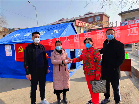 防疫物資緊缺是開展防疫工作面臨的共同難題。王七峰在防疫工作開始后,第一時(shí)間向城南辦事處捐助資金5萬(wàn)元,并發(fā)動(dòng)親屬積極捐款,其三哥王永紅捐助資金2萬(wàn)元支持城南辦事處疫情防控工作,14歲的侄子王璽博也將自己的5000元壓歲錢捐了出來(lái),為抗擊疫情助力。之后,王七峰除了統(tǒng)籌村里的防疫工作外,每天早上6點(diǎn),還會(huì)準(zhǔn)時(shí)到村里各個(gè)防控點(diǎn)或巡查或值守,始終堅(jiān)守在排查登記、區(qū)域防控第一線。有了王七峰的帶頭表率,該村的干部、黨員、志愿者紛紛加入抗疫隊(duì)伍中來(lái),村民們也是有錢出錢、有力出力,大家眾志成城,有效落實(shí)了聯(lián)防聯(lián)控、群防群治的各項(xiàng)措施。