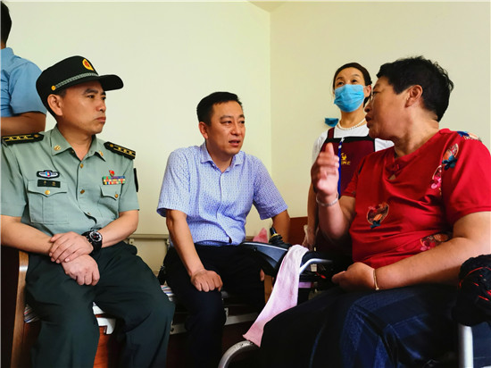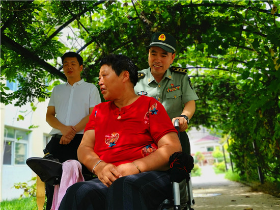 走進位于太昊路上的周口市老年護理院,院內(nèi)整潔有序、花蕊吐香鳥鳴聲聲,小徑通幽處的涼亭內(nèi)三五老人打牌、聊天,一副愜意安詳?shù)纳顖鼍?。在侯國領母親王玉勤居住的房間內(nèi),李揚、孫光濤等人坐在床邊與她聊天談心,看到這么多人來慰問她,王玉勤眼中流下了感動的眼淚,她對慰問人員表示感謝,說自己來護理院近一年來,吃住條件都不錯,護理院照顧的無微不至,身體一天天恢復,閑暇時還能不依賴輪椅自己走上一段路。她激動地說:“感謝黨和政府的親切關懷,我最大的愿望是希望倆兒子永遠聽黨的話,在部隊安心服役、再立新功,用優(yōu)異的成績回報黨和政府對我們?nèi)业年P愛?!?/p>