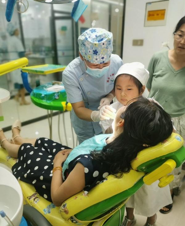 孩子最喜歡的環(huán)節(jié)是穿上“白大褂”,在診療室里,用剛剛學(xué)到的口腔保健知識在醫(yī)生的指導(dǎo)下給自己的爸爸媽媽進(jìn)行了口腔檢查。讓孩子們體驗真實的牙醫(yī)職業(yè),增強愛護(hù)牙齒的意識?! ?