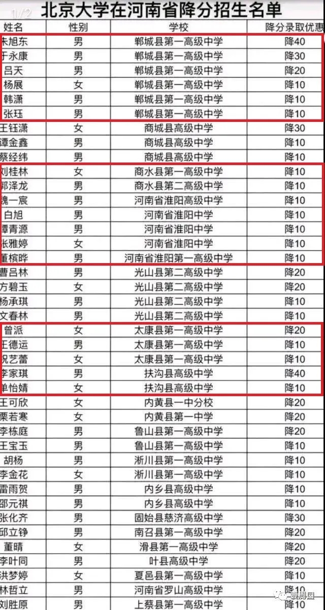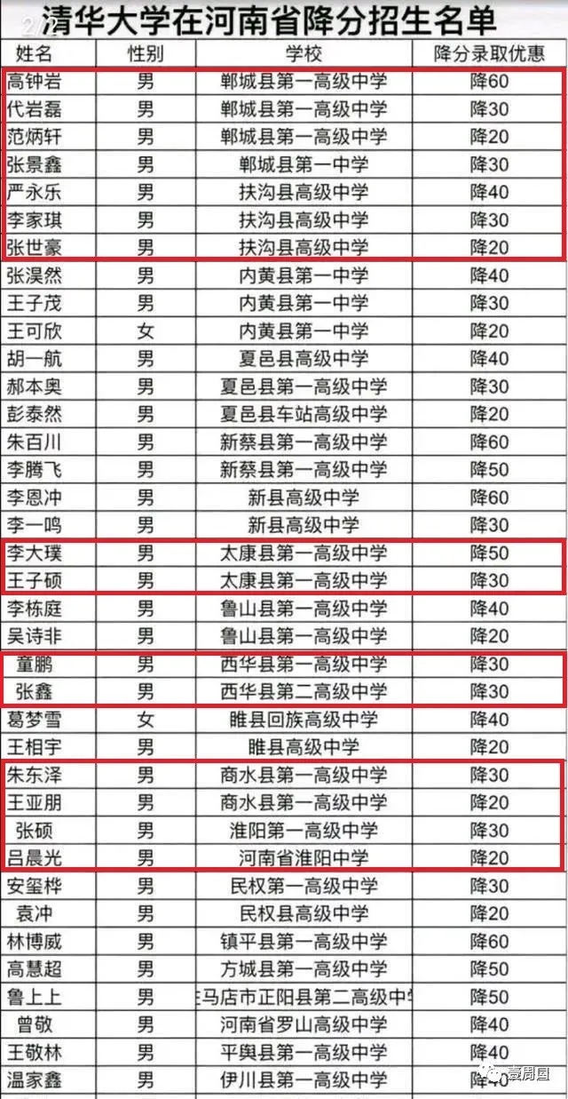 其中北京大學(xué)最高降分為40分,最低降分為10分。清華大學(xué)在河南招生最高降分為60分,最低降分為20分。