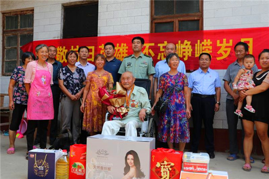 于永前一行來(lái)到楊廟鄉(xiāng)大祁行政村時(shí)已近中午,正趕上97歲抗日老戰(zhàn)士吳之太過(guò)生日。吳之太老少一家人歡聚一堂,其樂(lè)融融??吹轿繂?wèn)組的到來(lái),老人喜極而泣。吳之太老人擦著眼淚說(shuō):這些年沒(méi)少給黨和政府找麻煩,尤其是縣退役軍人事務(wù)局成立后,幫助他解決了好多困難和問(wèn)題,并定期來(lái)看望他,今天又見(jiàn)到大家,真不知道該說(shuō)什么好。潘布道代表退役軍人事務(wù)局向老人祝賀生日并告訴老人說(shuō):抗戰(zhàn)老戰(zhàn)士是民族的英雄、國(guó)家的財(cái)富,為黨的革命和建設(shè)作出了不可磨滅的貢獻(xiàn)。今后,將一如既往地關(guān)心和幫助抗戰(zhàn)老戰(zhàn)士,盡力幫助解決生活中的實(shí)際問(wèn)題,在全社會(huì)形成尊重抗戰(zhàn)老戰(zhàn)士、尊崇抗戰(zhàn)老戰(zhàn)士、關(guān)愛(ài)抗戰(zhàn)老戰(zhàn)士的良好氛圍。
