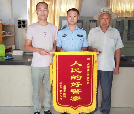 “沒(méi)想到,真沒(méi)想到,我這輩子還能與兒子相見(jiàn),太感謝你了?!弊蛉眨惓强h虎崗鄉(xiāng)派出所戶籍室門(mén)口鞭炮齊鳴,該鄉(xiāng)王寨行政村75歲的貧困戶王洪周和兒子王鐵練及親屬向戶籍民警姚東亮送上錦旗后,感激之情溢于言表。