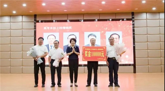 與會領(lǐng)導(dǎo)為40名本科上線增幅獎、標(biāo)兵教師、新銳獎、優(yōu)秀學(xué)科組等獲獎教師代表頒獎、獻花,并合影留念。