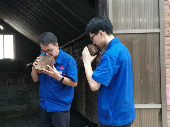 9月17日上午,大河網(wǎng)記者在河南仰韶酒業(yè)有限公司的制曲車間看到,曲磚生產(chǎn)線正在緊張生產(chǎn),張振科抓起傳送帶上的原料進行擠壓,查看原料的水分度和粉碎度。和生產(chǎn)線的工人交流后,張振科又和徒弟來到曲庫,分別拿起半塊曲磚,放到鼻子下,深深吸氣,嗅聞曲磚的曲香。