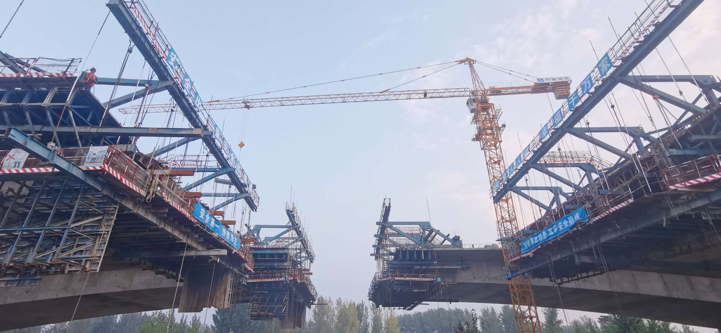 該橋東西兩側(cè)引橋采用40米預(yù)應(yīng)力箱梁,全橋40米預(yù)制箱梁252片,東側(cè)引橋梁板架設(shè)已全部完成正在進行橋面系施工,西側(cè)引橋已架設(shè)半幅。主橋采用預(yù)應(yīng)力變截面連續(xù)現(xiàn)澆梁,懸澆段共16個節(jié)段,采用四套菱形掛籃;左幅已施工至15號節(jié)段,即將開始合龍段施工;右幅已施工至12號節(jié)段。