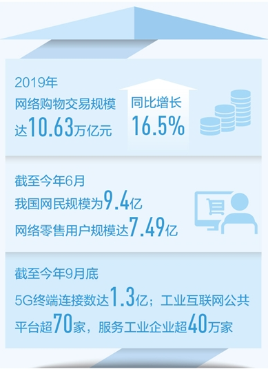 截至2020年6月,我國(guó)網(wǎng)民規(guī)模為9.4億,網(wǎng)絡(luò)零售用戶規(guī)模達(dá)7.49億。2019年網(wǎng)絡(luò)購(gòu)物交易規(guī)模達(dá)10.63萬(wàn)億元,同比增長(zhǎng)16.5%。截至今年9月底,5G終端連接數(shù)達(dá)到1.3億;制造業(yè)數(shù)字化轉(zhuǎn)型穩(wěn)步前進(jìn),工業(yè)互聯(lián)網(wǎng)公共平臺(tái)超過(guò)70家,服務(wù)的工業(yè)企業(yè)超過(guò)40萬(wàn)家……如今,數(shù)字經(jīng)濟(jì)蓬勃發(fā)展,成為經(jīng)濟(jì)發(fā)展的新增長(zhǎng)點(diǎn),產(chǎn)業(yè)數(shù)字化與數(shù)字產(chǎn)業(yè)化的基礎(chǔ)更加堅(jiān)實(shí),不斷為高質(zhì)量發(fā)展注入新動(dòng)能。