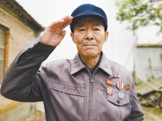 聽(tīng)說(shuō)記者要為他照相,老人立即要求家人為他換身干凈的衣服,認(rèn)真把軍功章、獎(jiǎng)?wù)乱灰淮髟谏砩希p腿合攏,努力地挺直上身,對(duì)著鏡頭打了一個(gè)標(biāo)準(zhǔn)的敬禮(如圖)。