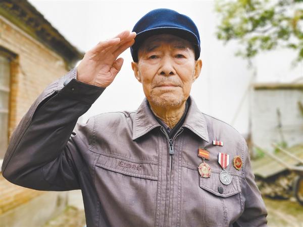 聽說記者要為他照相,老人立即要求家人為他換身干凈的衣服,很認(rèn)真地把軍功章、獎(jiǎng)?wù)乱灰淮髟谏砩?,雙腿合攏,努力地挺直上身,對(duì)著鏡頭打了一個(gè)標(biāo)準(zhǔn)的敬禮。