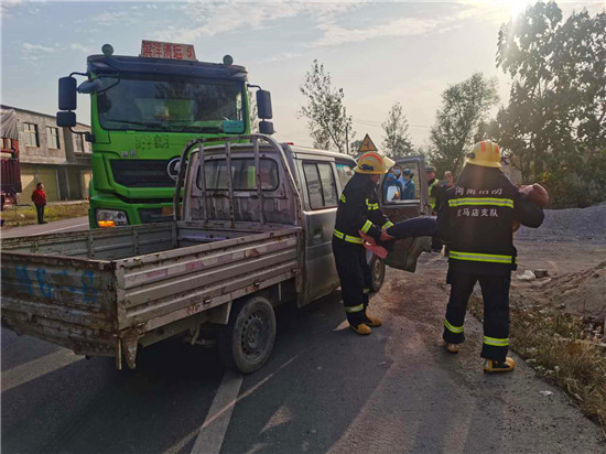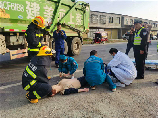 組織實施模擬演練過程中,上蔡縣公安局110指揮中心民警接到群眾報警后,迅即啟動方案,向交警大隊反饋事故相關(guān)情況,指令交警大隊事故處理中隊、有關(guān)部門和單位趕赴事故現(xiàn)場,實施救援處置。同時,向商水縣110指揮中心通報事故情況,請求協(xié)作開展交通事故應(yīng)急救援工作。