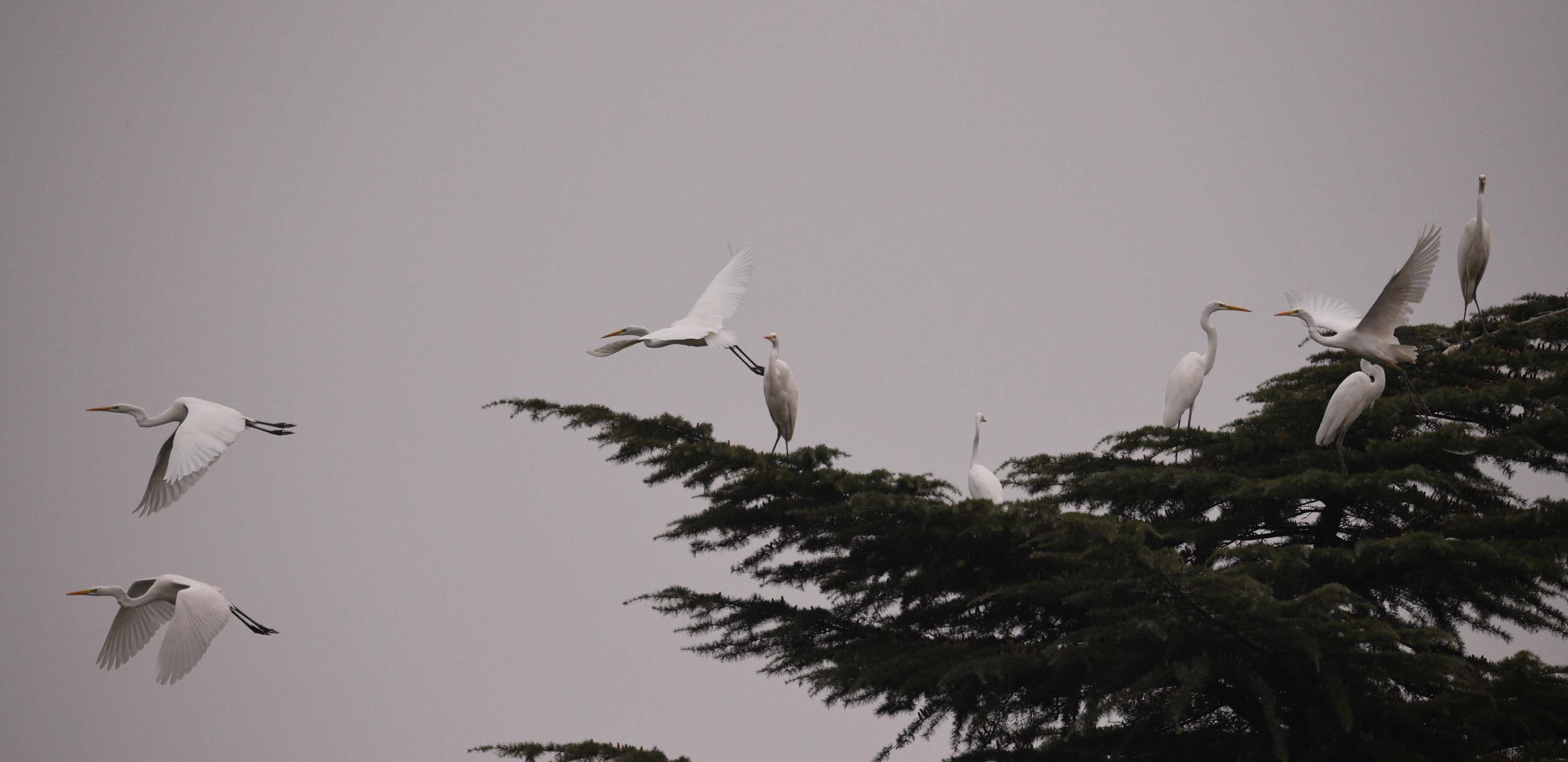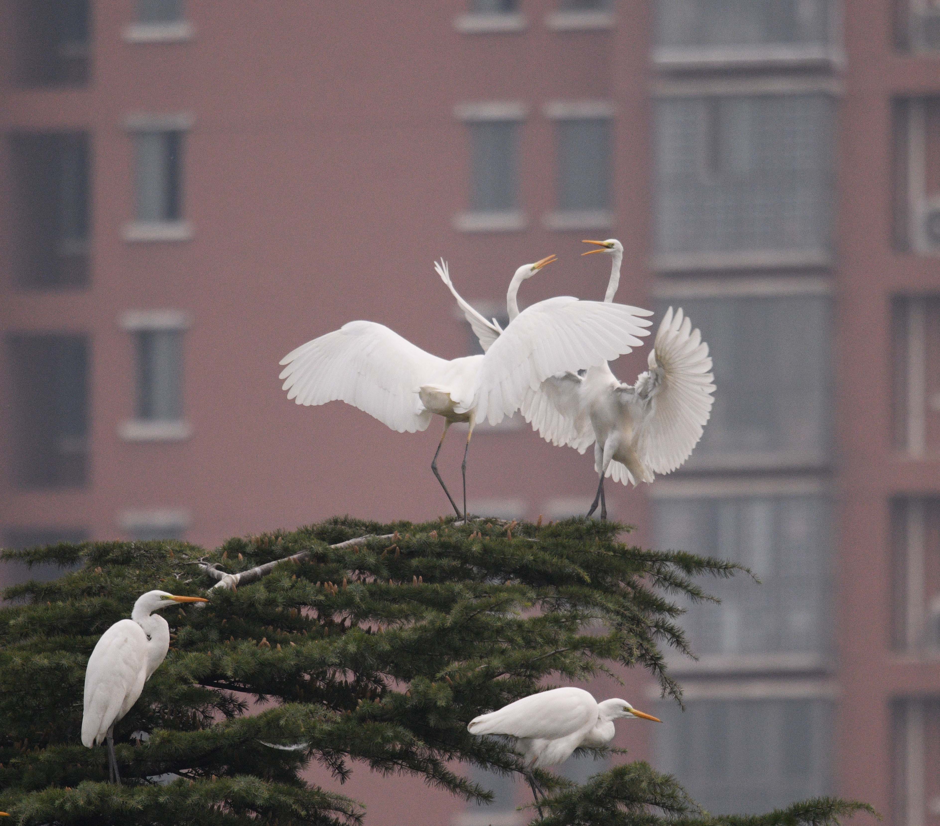 近日,市區(qū)漢陽路沙潁河大閘的中心島林間,飛來近百只白鷺。這里幽靜舒適的環(huán)境和河里豐富的魚蝦,滿足它們棲息和生活。它們面對行人,不驚不詫,時而盤旋嬉戲,時而捉魚果腹。人鳥和諧相處,構(gòu)成美麗的生態(tài)風(fēng)情。②9