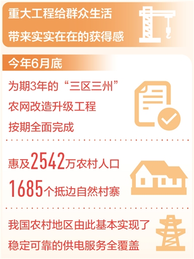 從“用上電”到“用好電”,今年6月底,為期3年的“三區(qū)三州”農(nóng)網(wǎng)改造升級(jí)工程按期全面完成,惠及2542萬農(nóng)村人口、1685個(gè)抵邊自然村寨,我國農(nóng)村地區(qū)由此基本實(shí)現(xiàn)了穩(wěn)定可靠的供電服務(wù)全覆蓋。