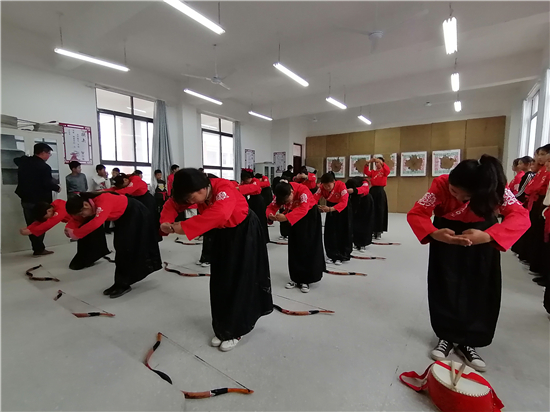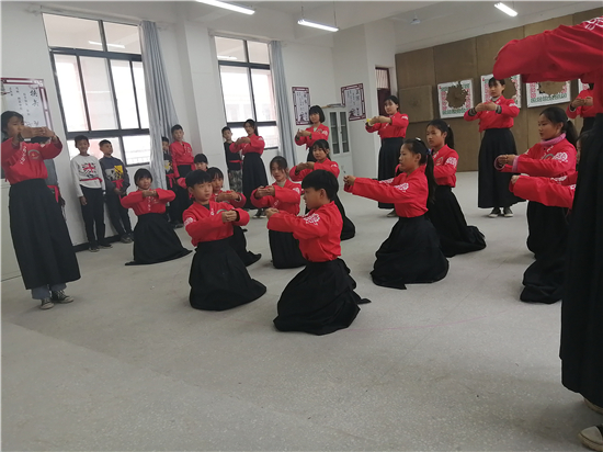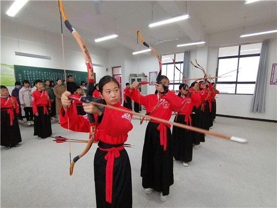 在皮營學(xué)校活動(dòng)室,學(xué)校舞蹈社團(tuán)的小朋友展示了傳統(tǒng)儀式《鹿鳴》,深情的演繹,展示了他們對(duì)國學(xué)經(jīng)典的理解。禮射是禮樂文明重要組成部分,習(xí)射先習(xí)禮,射以觀德。習(xí)射可以強(qiáng)健體魄,其中還蘊(yùn)含了眾多古人先賢的智慧。皮營學(xué)校禮射興趣班的小朋友進(jìn)行禮射表演,隨著挾矢,正筈,審固,舉弓,引彀,發(fā)矢,斂弓,執(zhí)弦等一系列指令,拈弓搭弦展示禮射八法。在這里,學(xué)生們通過不同方式的展示,詮釋自己對(duì)“禮”“樂”的理解和認(rèn)知。