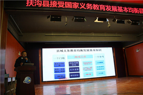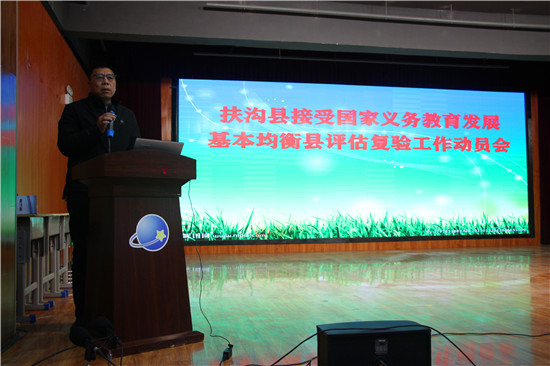 今年是河南省義務(wù)教育發(fā)展基本均衡縣評估的收官之年,扶溝縣將接受國家的抽查復(fù)驗。為進(jìn)一步做好迎接國家義務(wù)教育發(fā)展基本均衡縣評估復(fù)驗工作,11月25日上午,扶溝縣教體局召開了接受國家義務(wù)教育發(fā)展基本均衡縣評估復(fù)驗工作動員會。教體局全體領(lǐng)導(dǎo)班子、股室負(fù)責(zé)人、包鄉(xiāng)人員,各鄉(xiāng)鎮(zhèn)(街道)中心校校長、普教專干、初中校長及迎驗學(xué)校校長300余人參加會議。