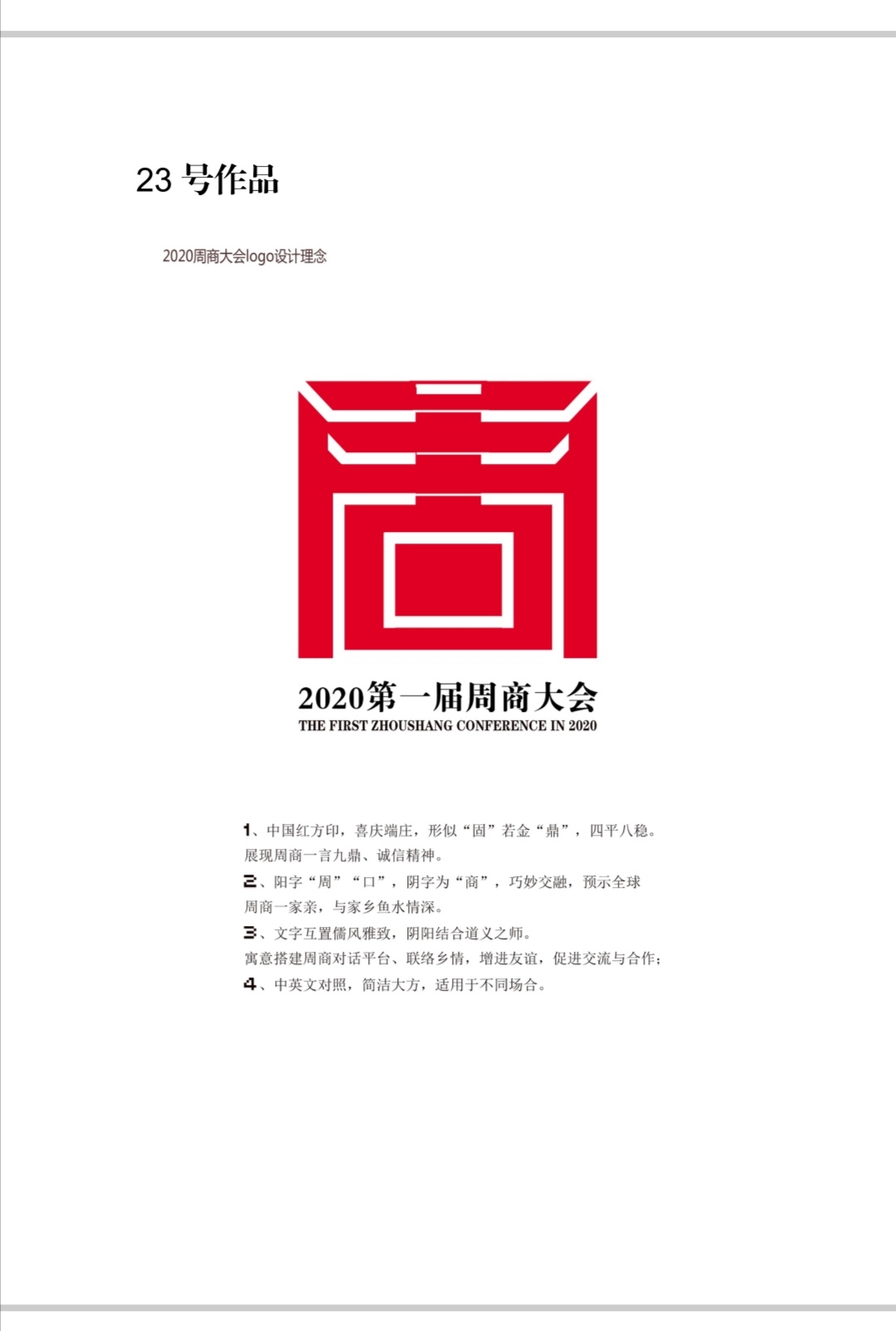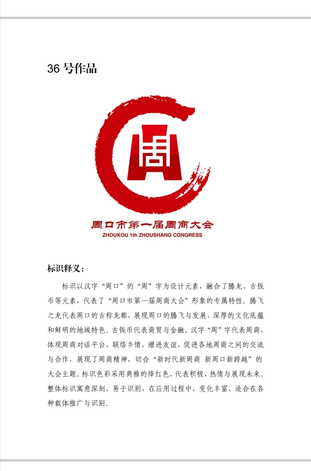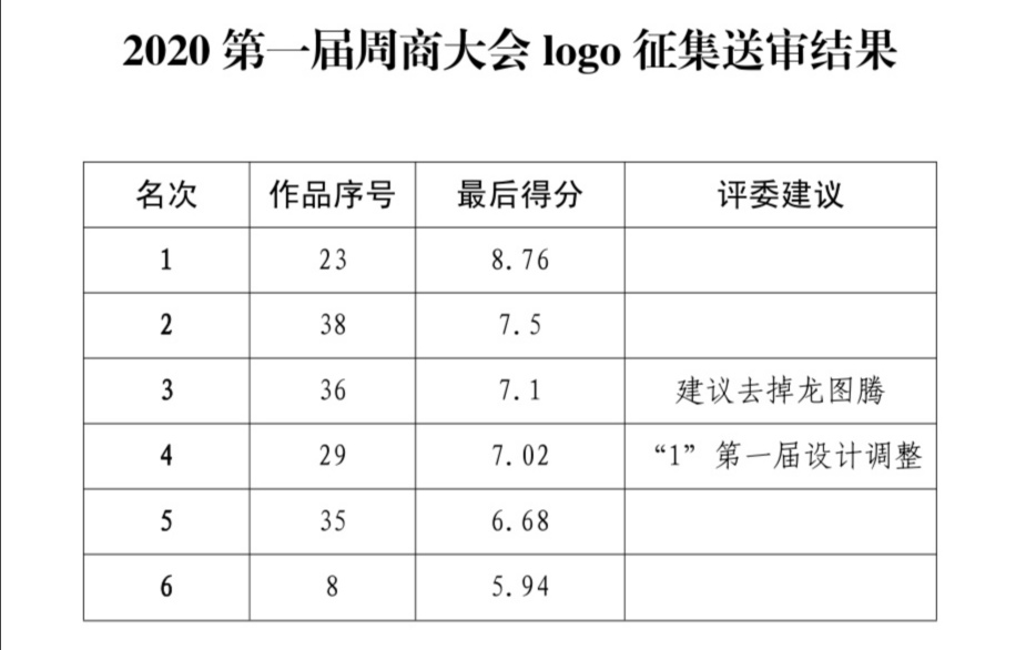 自11月12日起面向社會公開征集第一屆周商大會主題會標,截至11月19日24:00時,大會工作組共征集到來自10個省轄市的作品67件。11月20日上午10:00時,對作品進行統(tǒng)一編號后,經(jīng)專家評審團評審出55幅進入評選,經(jīng)逐項打分初評出6件作品,最后按綜合得分前三名作品入圍。