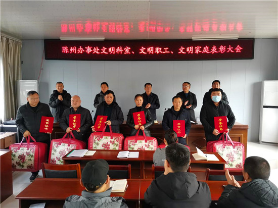 疫情防控辦公室、黨政辦公室獲得“文明科室”稱號;王志國、史路路獲得“文明職工”稱號;鄒亮家庭、武志強(qiáng)家庭等6個家庭獲得“文明家庭”稱號。大會為獲獎集體和個人頒發(fā)了獎牌、榮譽(yù)證書和獎品。取得榮譽(yù)的先進(jìn)集體和個人,集中展示了陳州辦事處的文明形象和干部職工的職業(yè)道德、家庭美德和個人品德,為文明單位創(chuàng)建增添光彩。