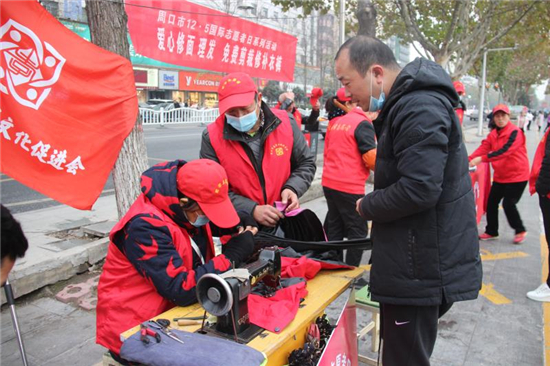12月6日下午,周口市慈孝文化促進(jìn)會(huì)、周口環(huán)境保護(hù)協(xié)會(huì)的志愿者來到周口中心城區(qū)五一文化廣場(chǎng)開展以愛心剪發(fā)、免費(fèi)剪裁、修補(bǔ)衣褲為主要內(nèi)容的便民志愿服務(wù)活動(dòng)。