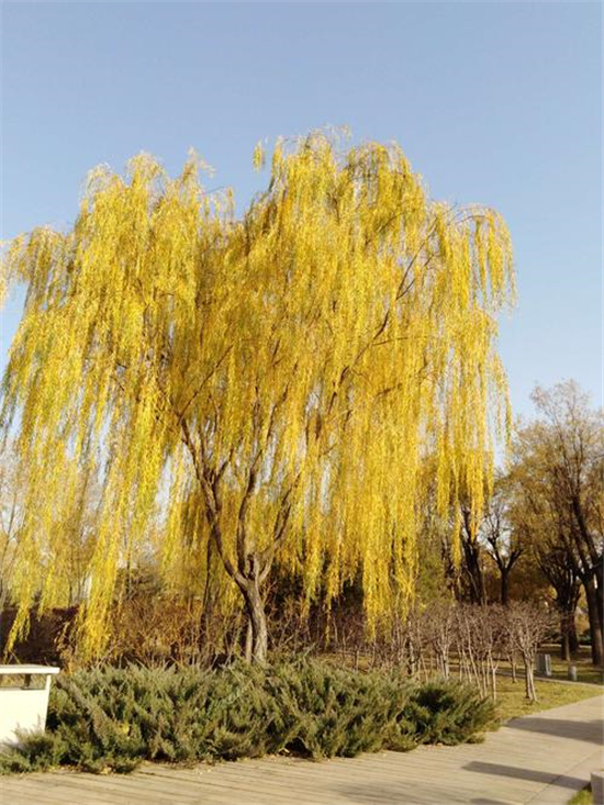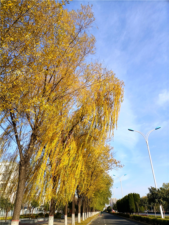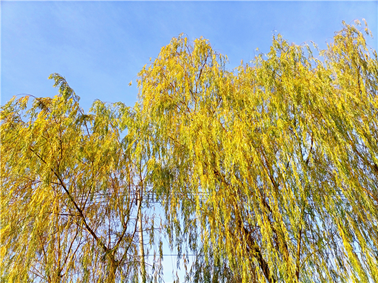 冬日暖陽照三川,垂柳更換鵝黃衫。無盡情思春可寄,千條萬條隨風(fēng)翩。12月15日,我市天氣晴朗,路旁一排排垂柳隨風(fēng)搖曳,像一個(gè)個(gè)舞動的小精靈,又像一團(tuán)團(tuán)鵝黃色的薄霧,如此美不勝收的風(fēng)景就像一幅畫,令人忍不住駐足欣賞。