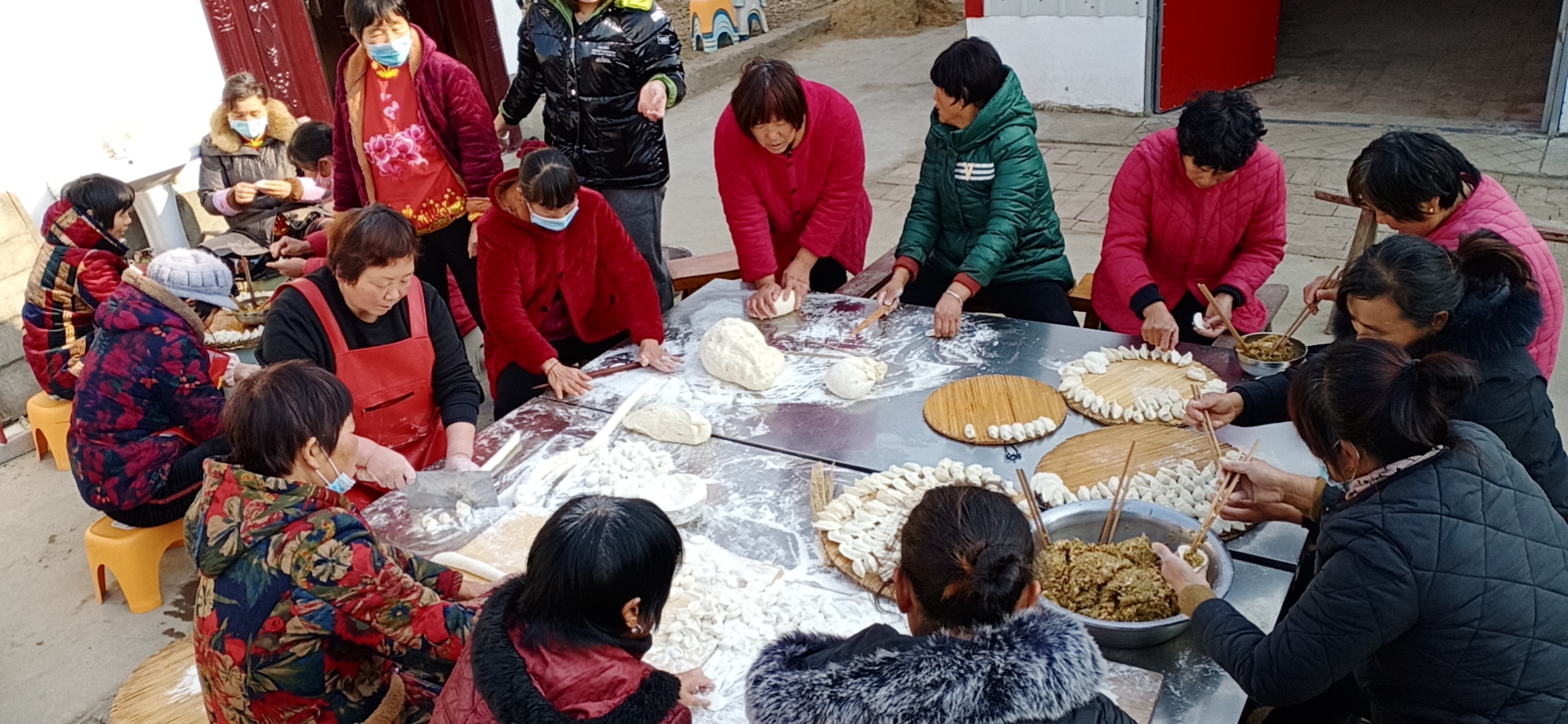 鄉(xiāng)村大食堂院子里,大家有說(shuō)有笑,圍在數(shù)平方米的巨大案板前,個(gè)個(gè)拿出了看家本領(lǐng),分工協(xié)作,揉面、搟皮、包餃子,個(gè)個(gè)動(dòng)作嫻熟,包起餃子來(lái)麻利干練,不知不覺(jué)間,面前的盤子里就擺滿了餃子。