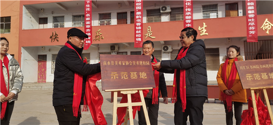 與會領(lǐng)導(dǎo)分別為“川匯區(qū)書畫院書法進(jìn)校園示范基地”“商水縣書法家協(xié)會書法進(jìn)校園示范基地”“商水縣美術(shù)家協(xié)會美術(shù)進(jìn)校園示范基地”揭牌。中國書法家協(xié)會會員、中國作家協(xié)會會員、周口師范學(xué)院特聘教授張華中,周口市書法家協(xié)會副秘書長、川匯區(qū)文聯(lián)副主席游富華,以及我縣原政協(xié)副主席、商水縣美術(shù)家協(xié)會主席司新國,河南省書法家協(xié)會會員、文聯(lián)主席劉秋玲,中國書法家協(xié)會會員、商水縣書協(xié)主席趙世貴 ,中國美術(shù)家協(xié)會會員郭保同,河南省書法家協(xié)會會員關(guān)保證、王艷飛、沈曉虹,河南省美術(shù)家協(xié)會會員李飛等市縣知名書畫家向?qū)W校捐贈了墨寶。