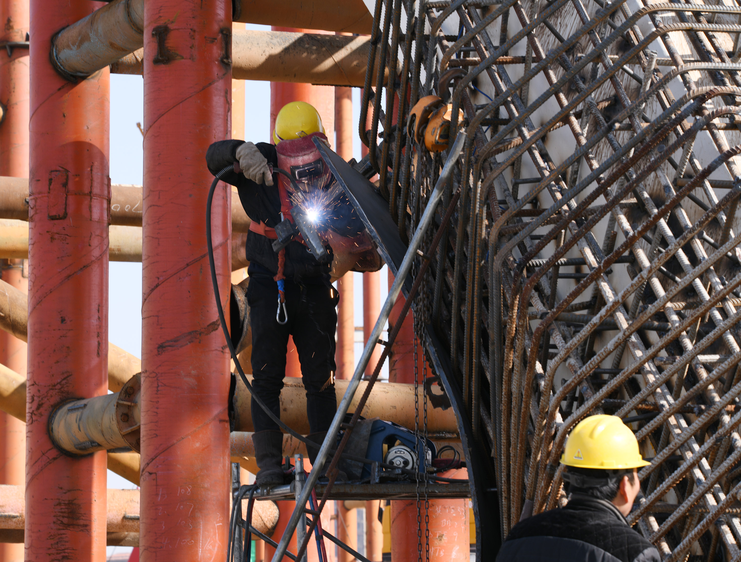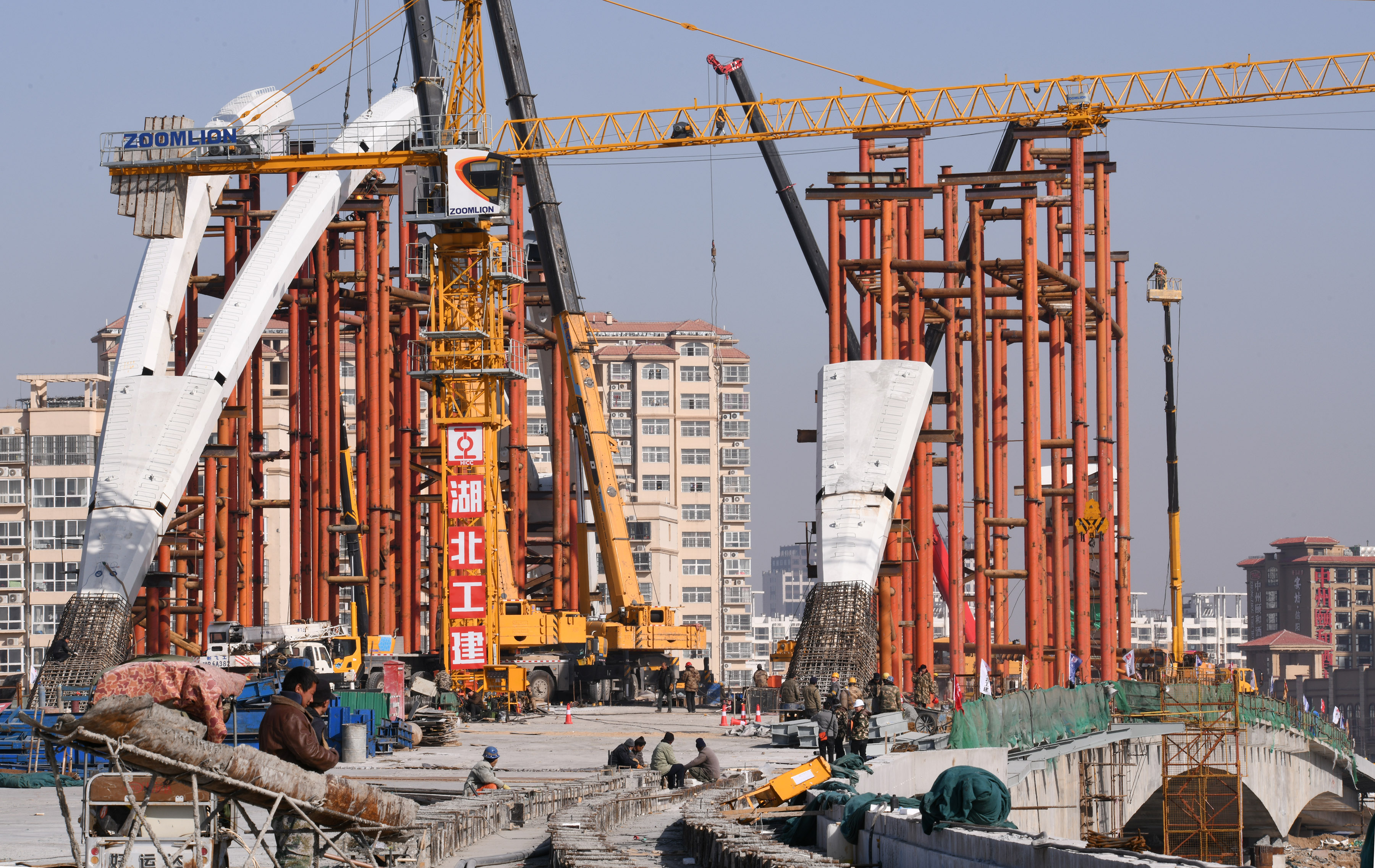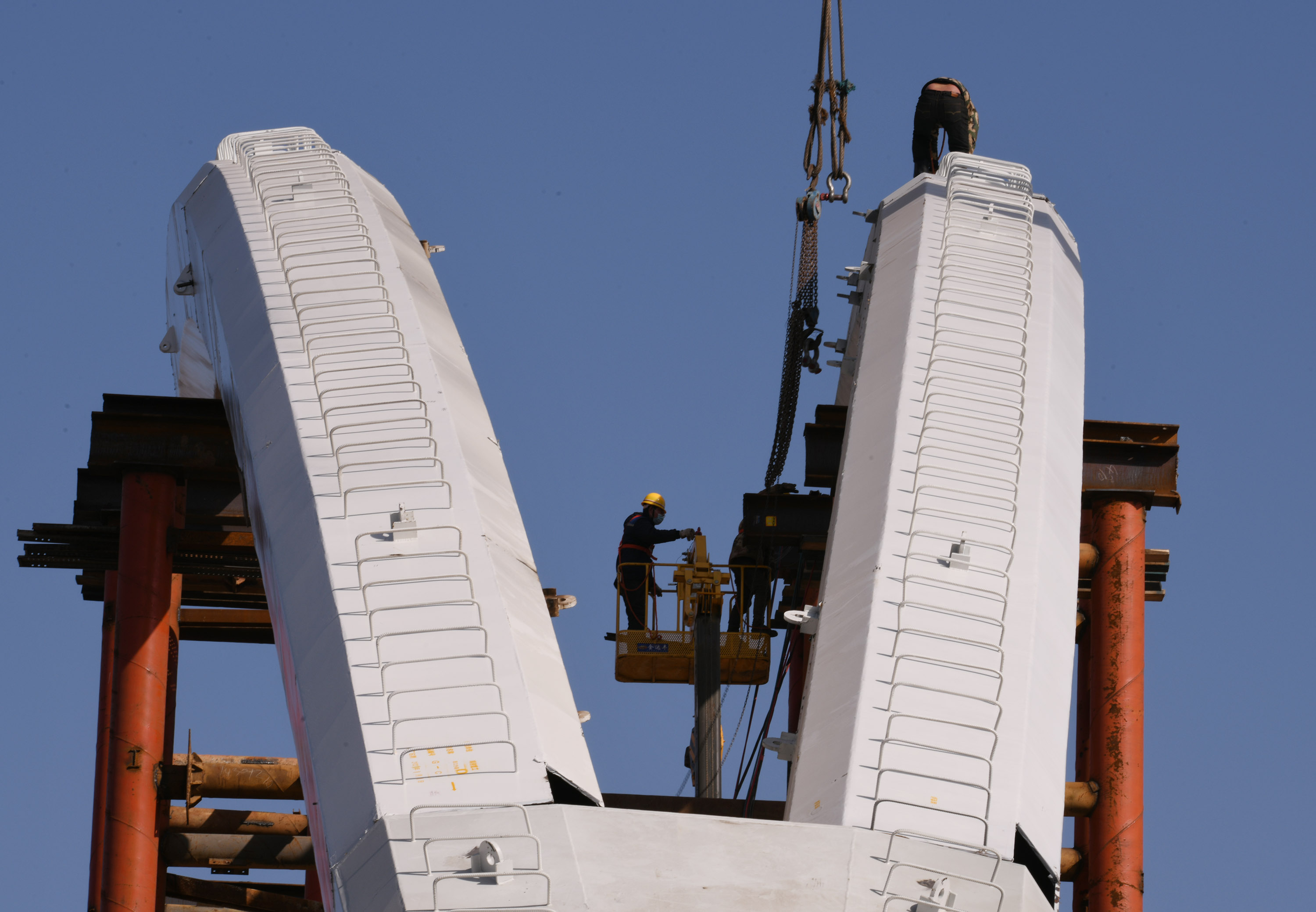 “一輪明月照古城”是中原路跨沙潁河大橋在諸多跨沙潁河大橋中獨居特色的風情。眼下,中原路跨沙潁河大橋合攏之后,橋面建設處于緊鑼密鼓之中,并開始進入安裝“月亮”施工階段。記者在施工工地看到,吊車往來,吊臂上下吊裝著材料,隨著工人們忙碌地焊接、安裝,“月牙”已經乍現(xiàn)。