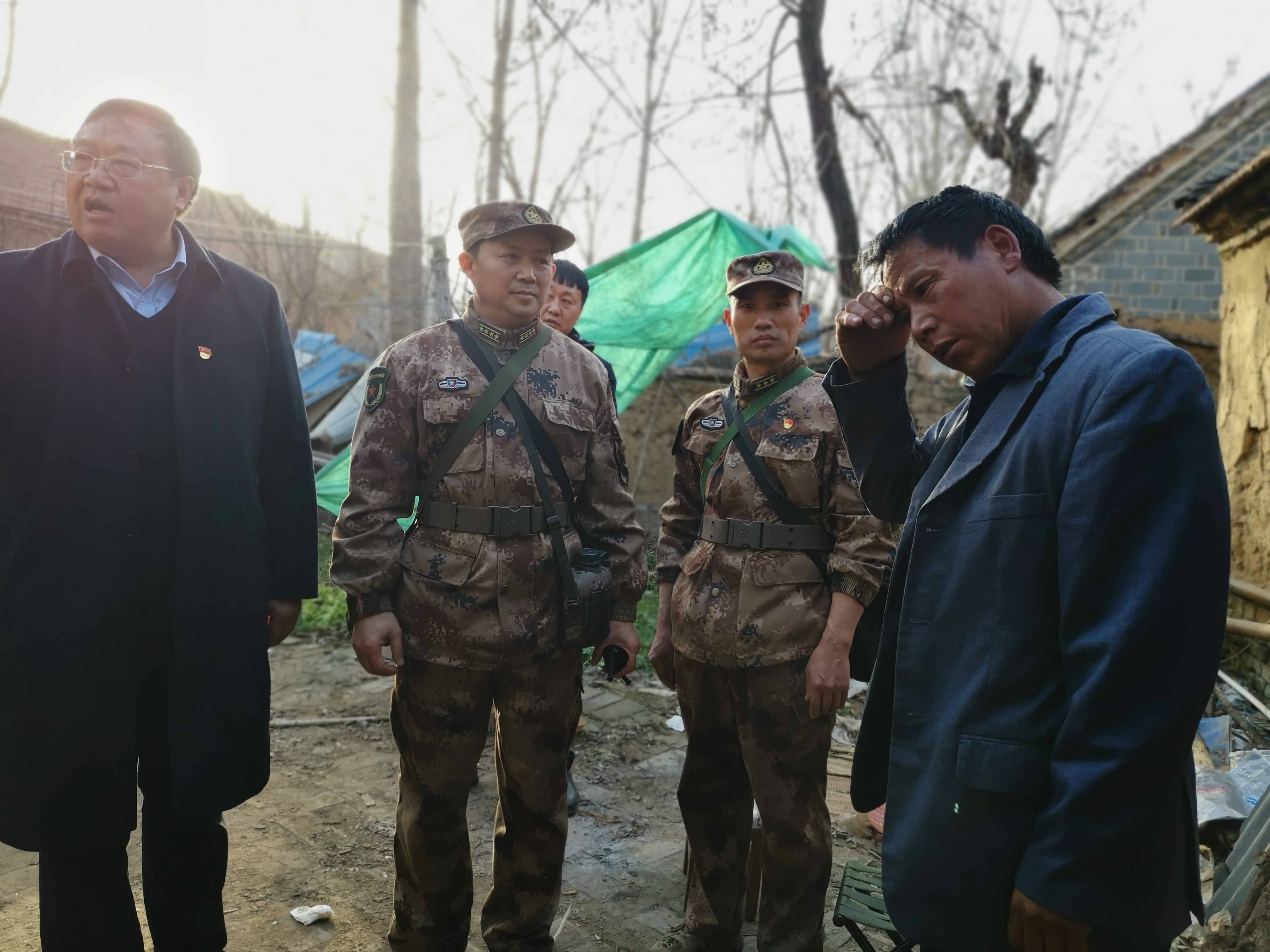 周口軍分區(qū)還將政治工作貫穿于野營(yíng)拉練全過(guò)程,當(dāng)行至周口港區(qū)苑寨行政村時(shí),薛振喜、周口軍分區(qū)政治工作處主任李揚(yáng)以及川匯區(qū)人武部部長(zhǎng)陳繼芳、政委高新傳等來(lái)到貧困戶苑立中家中慰問(wèn),為他們送去米面糧油等慰問(wèn)品??粗?jiǎn)陋的房屋,得知苑立中獨(dú)自一個(gè)人拉扯3個(gè)孩子的艱辛生活后,薛振喜囑咐當(dāng)?shù)卣臀溲b部門要想辦法幫扶這戶貧困家庭。 苑立中激動(dòng)地流下眼淚,握著薛振喜的手連聲感謝。