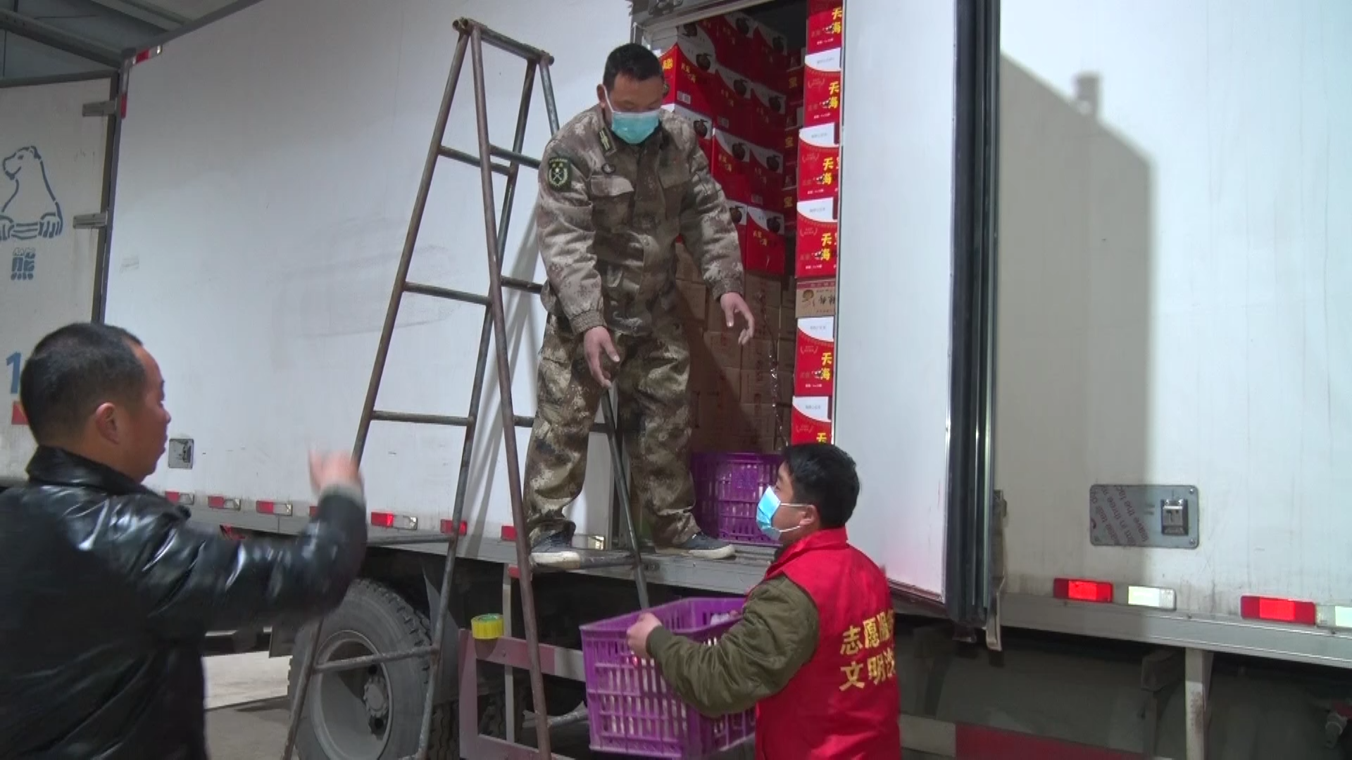 王國輝說:“咱們對接的就是河北南宮市,但是南宮市的工作人員考慮到咱們的安全,也不讓咱們進入南宮的地域,而是去衡水,衡水是低風險,現(xiàn)在不在風險區(qū),這是對方為我們著想。我們把貨到了衡水的外圍一個指定的開闊地方,我們把貨卸下來,我們撤離,然后南宮的同志再過來,轉(zhuǎn)運到他們車上去?!?/p>