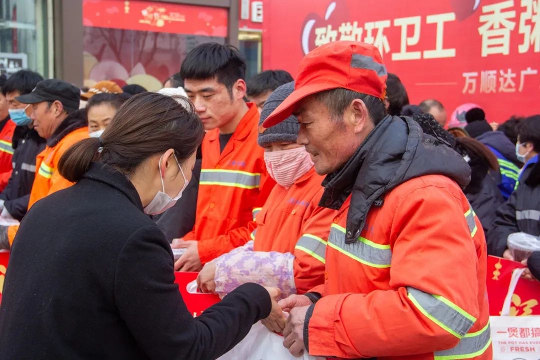 據(jù)了解,萬順達廣場為了本次活動,精心為環(huán)衛(wèi)工人、公安民警準備了八寶粥、披薩、油條等營養(yǎng)早餐,還有口罩等防疫用品,毛巾、春聯(lián)等生活用品。