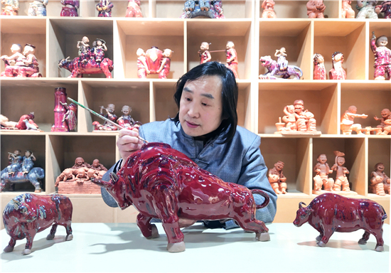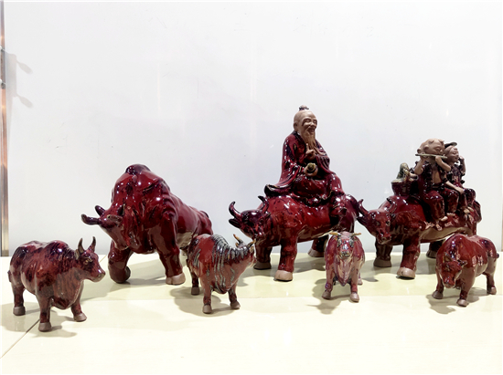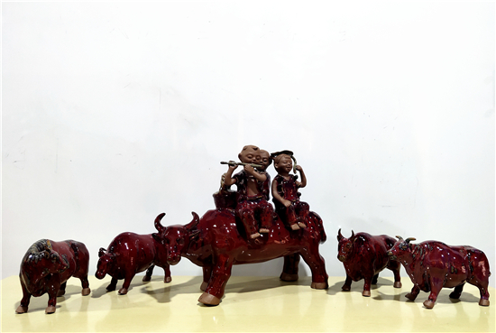 春節(jié)前夕,鄲城泥塑大師張振福歷時多日制作一組鈞瓷泥塑群雕《瑞牛賀新春》。該組作品分為三頭長約90厘米的大牛和若干頭小牛,均為鈞瓷泥塑,采用豫東黃泥和粗獷手法制作,上釉時入窯一色,歷經(jīng)1200多攝氏度高溫?zé)坪蟪龈G萬變,十分精彩。拓荒牛精神,展現(xiàn)中國人自立自強的志氣;孺子牛精神,體現(xiàn)在創(chuàng)造美好生活的時代課題中;老黃牛精神,貴在“心有大我、至誠報國”的奉獻品格。