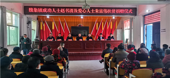1月29日,天氣乍暖還寒,魏集鎮(zhèn)政府人頭攢動,喜氣洋洋,一片熱鬧的景象。內蒙古希拉穆仁旅游置業(yè)開發(fā)有限公司董事長、內蒙古楊子照明鋼桿制造有限責任公司董事長、內蒙古周口商會會長趙書清和愛心人士朱富偉一行,帶著整整兩卡車米、面、油共計八萬元生活物資,回到家鄉(xiāng)魏集鎮(zhèn)開展扶貧濟困活動,在嚴寒的冬日給魏集鎮(zhèn)困難群眾帶來了溫暖和祝福??h政協(xié)主席孫培忠,縣委常委、宣傳部長李本磊出席活動。魏集鎮(zhèn)黨委書記衛(wèi)春忙,鎮(zhèn)長劉艷光參加活動。