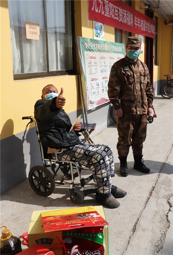 新橋鎮(zhèn)新兵楊凱入伍前和癱瘓的父親相依為命,市人武部領(lǐng)導(dǎo)協(xié)調(diào)地方政府,把其父親送到了新橋鎮(zhèn)敬老院公費(fèi)養(yǎng)老,解除他的后顧之憂。春節(jié)到了,人武部領(lǐng)導(dǎo)還牽掛著這個(gè)特困家庭,矯百成帶隊(duì)來(lái)到新橋鎮(zhèn)敬老院。此時(shí)正值中午,楊凱的父親正坐在屋外的輪椅上曬太陽(yáng),見(jiàn)到矯部長(zhǎng)的突然到來(lái),激動(dòng)的眼含熱淚,他緊緊握住矯百成的手久久不愿松開(kāi)。矯百成噓寒問(wèn)暖,給他送上1000元慰問(wèn)金和生活必需品,楊凱的父親用他那不太清晰的語(yǔ)言表達(dá)對(duì)部長(zhǎng)的真誠(chéng)感謝。在敬老院院長(zhǎng)的帶領(lǐng)下,矯百成又來(lái)到老人的住室察看起居情況,詢問(wèn)他平時(shí)生活狀況,當(dāng)?shù)弥先松畹暮苁娣r(shí),矯百成滿意的笑了。