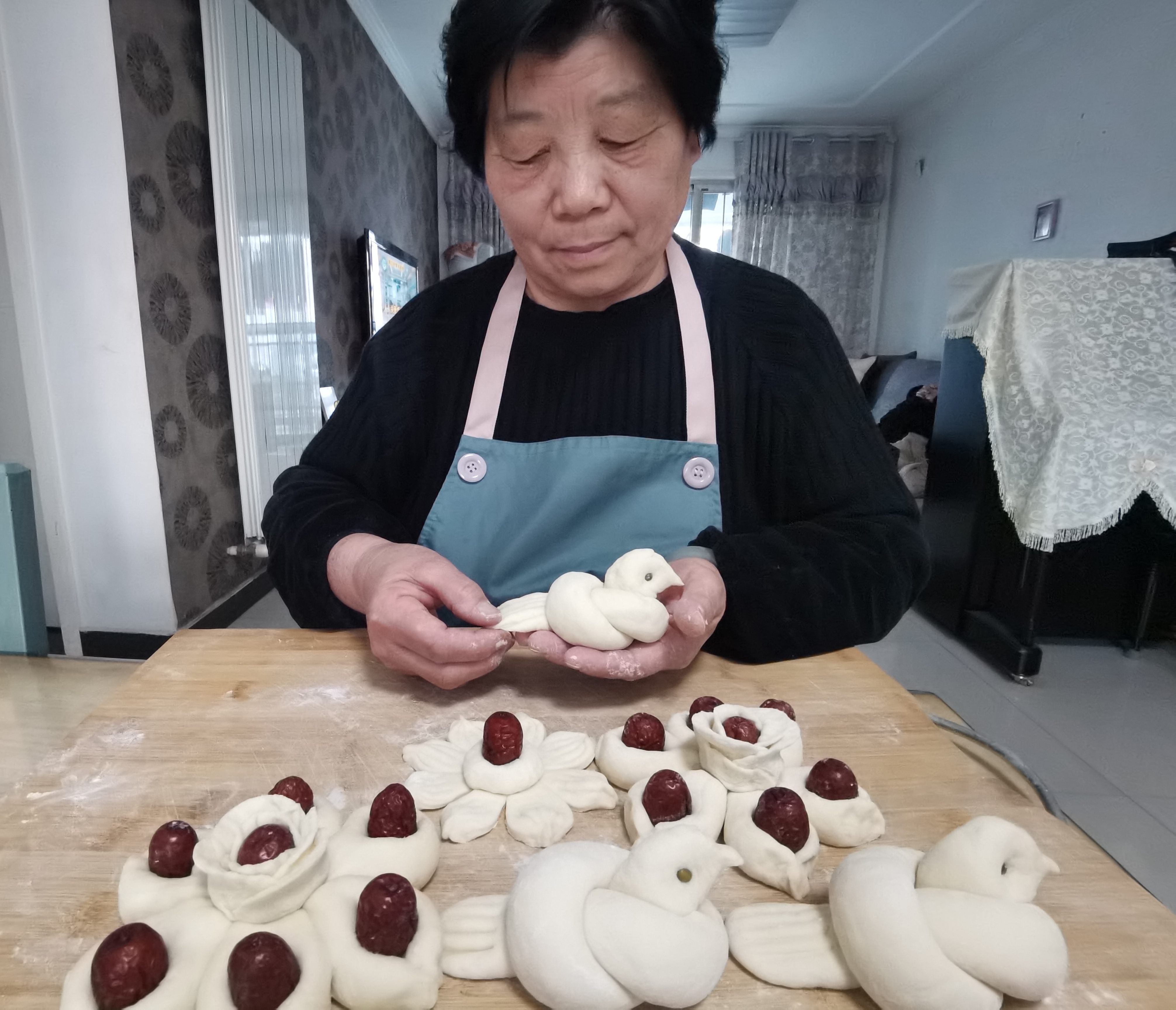 王大媽在蒸棗花饃,寓意著來(lái)年生活蒸蒸日上。