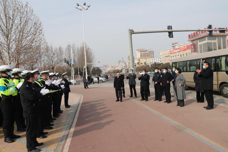 在縣人民廣場(chǎng),最后王國(guó)璽、李錫勇一行看望慰問(wèn)了正在執(zhí)勤的交警,與他們親切交談,對(duì)大家一年來(lái)作出的努力和貢獻(xiàn)表示感謝。勉勵(lì)廣大干警發(fā)揚(yáng)甘于奉獻(xiàn)、勇于擔(dān)當(dāng)?shù)木?,維護(hù)好全縣社會(huì)大局穩(wěn)定,確保全縣人民度過(guò)一個(gè)歡樂(lè)祥和的節(jié)日。